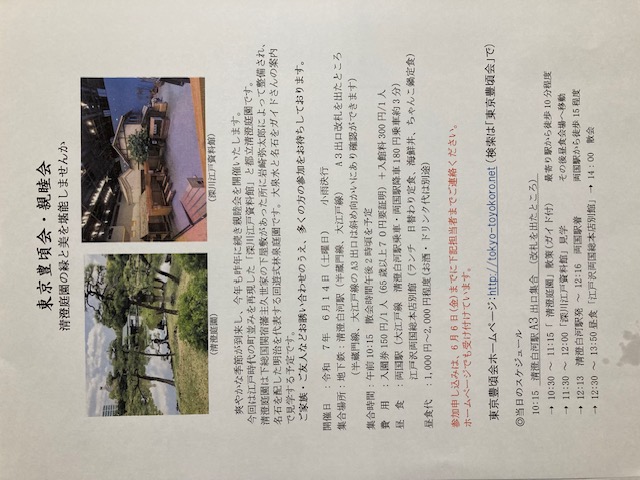 開催日時は、6月14日(土)、10時、清澄白河駅(半蔵門線、大江戸線)A3改札口集合とします。